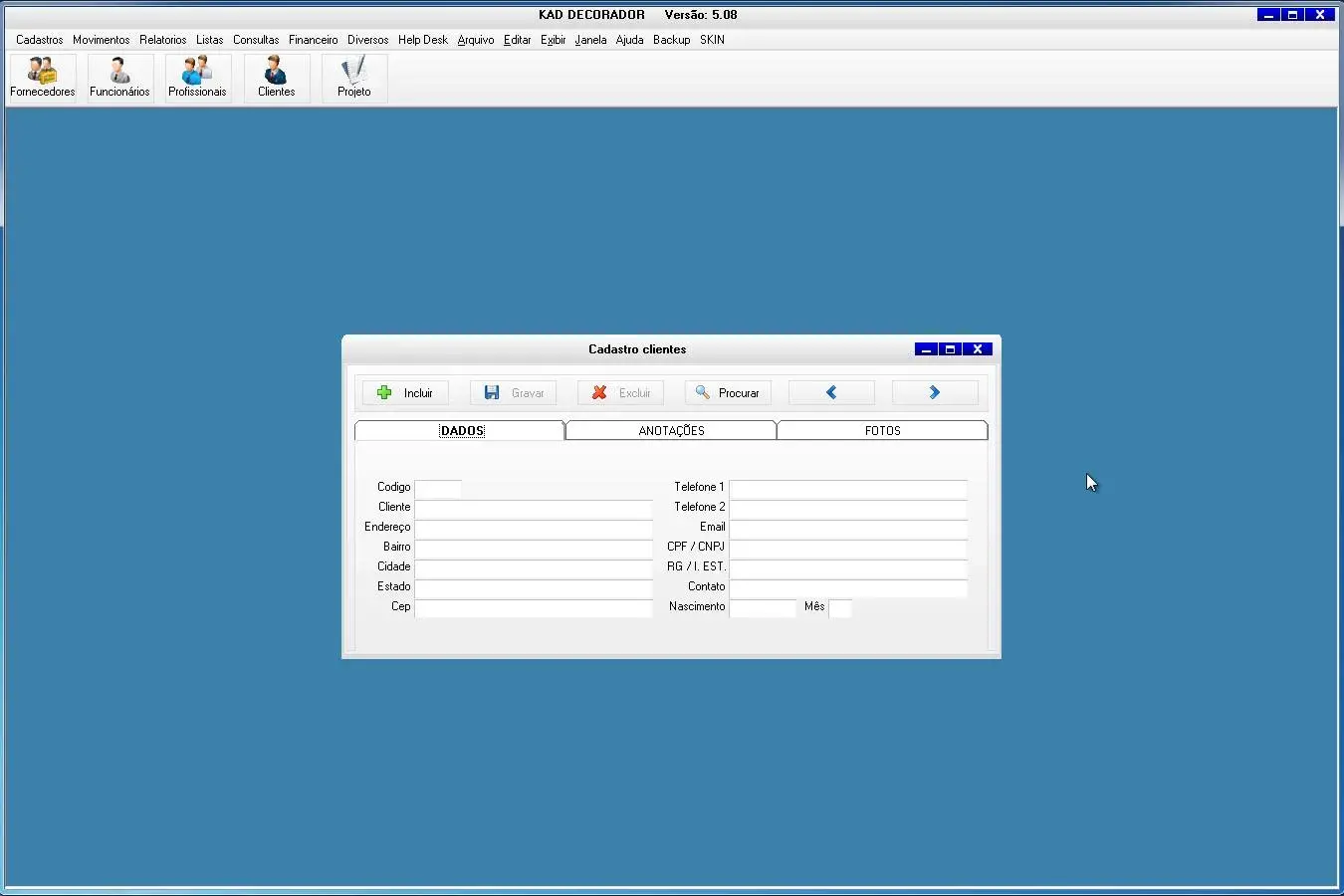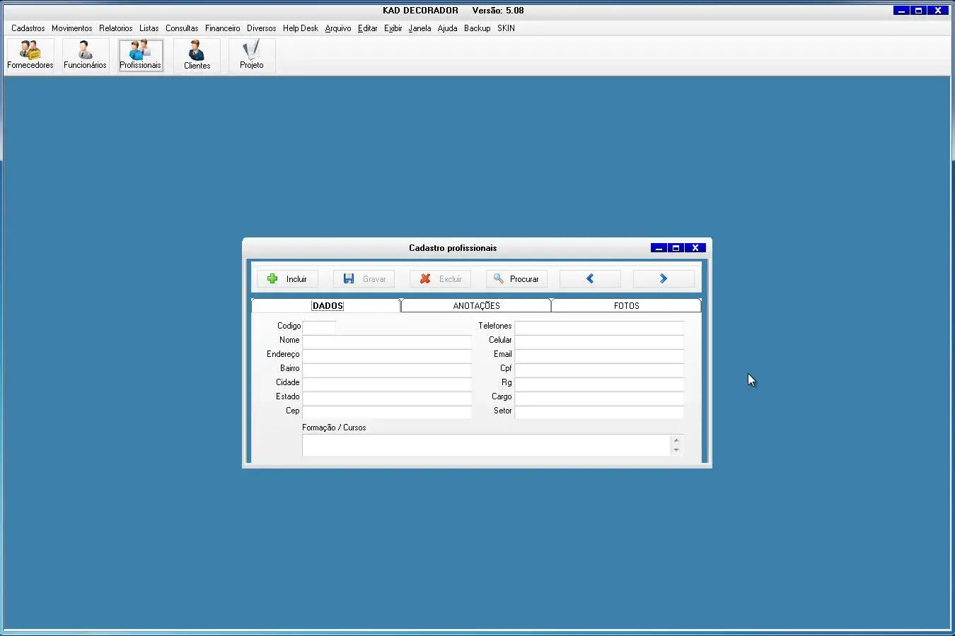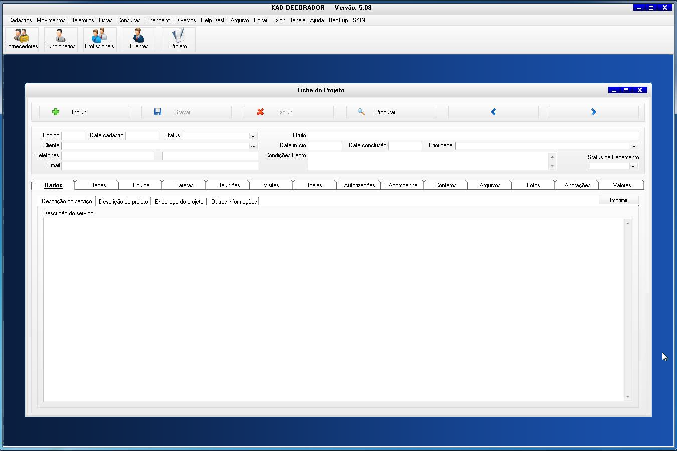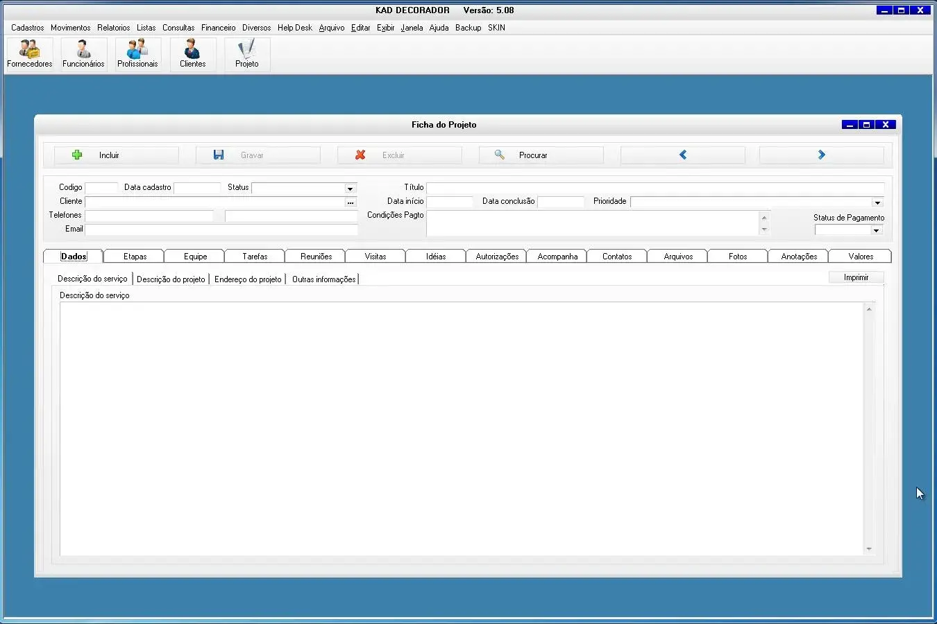 O programa para designer de interiores é fácil de usar e possui uma interface simples e objetiva, cadastre projetos e serviços com apenas alguns cliques