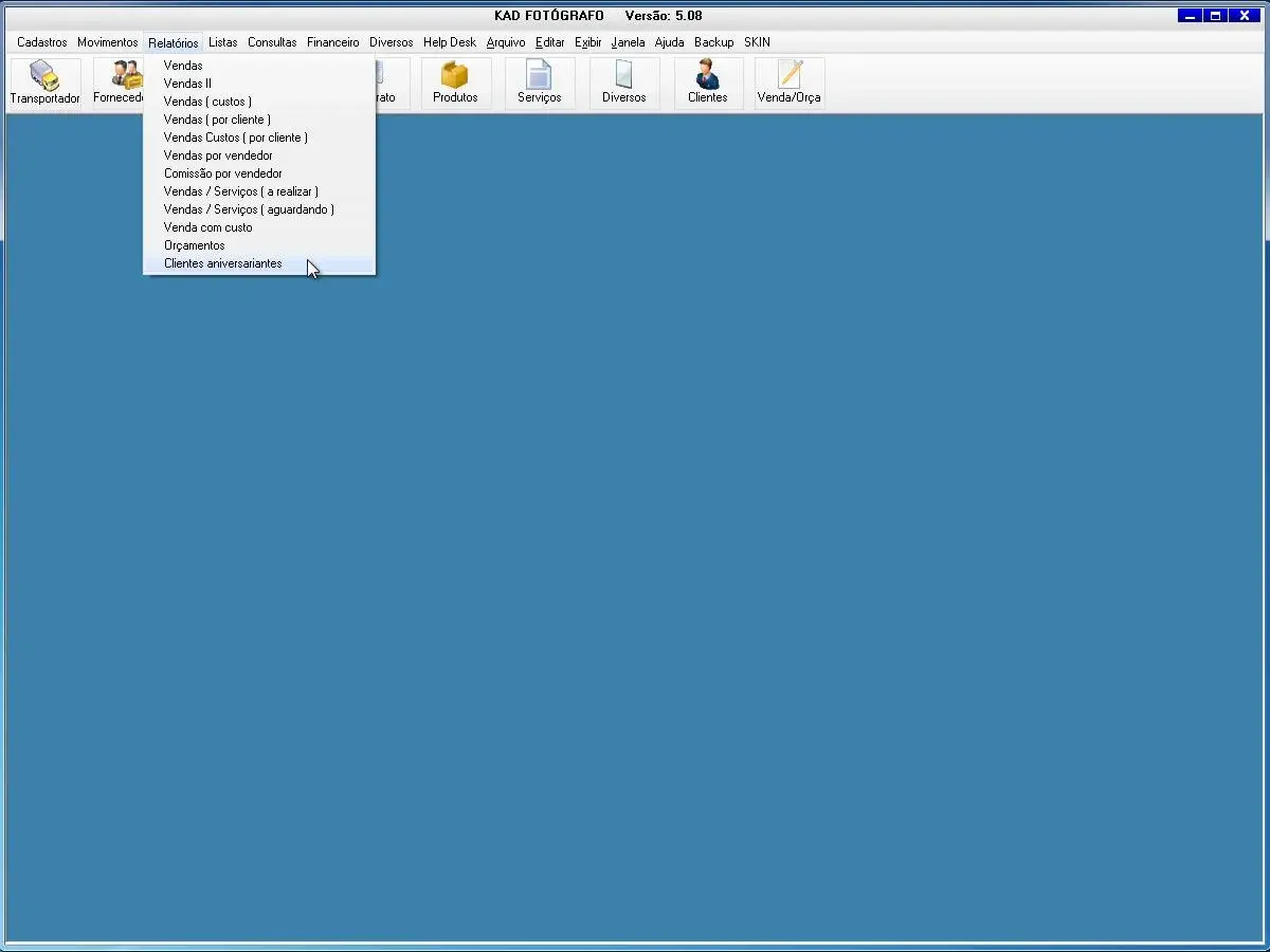 vendas, vendas II, vendas (custos), vendas (por cliente), vendas custos (por cliente), vendas por vendedor, comissão por vendedor, vendas/serviços (a realizar), vendas/serviços (aguardando), orçamento, venda com custo, clientes aniversariantes