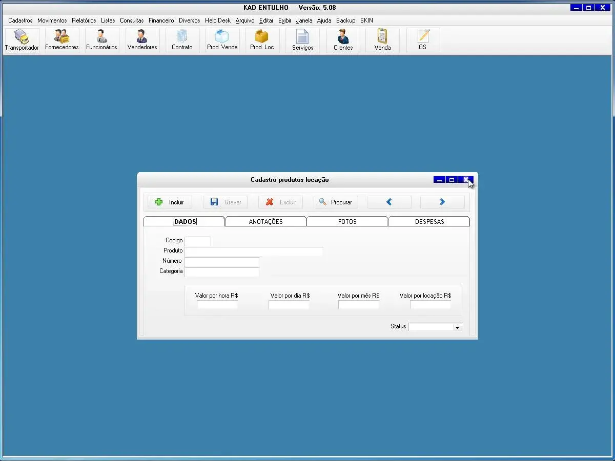 O programa para aluguel de caçambas possibilita o cadastro de locação por hora, por dia, por mês e por período