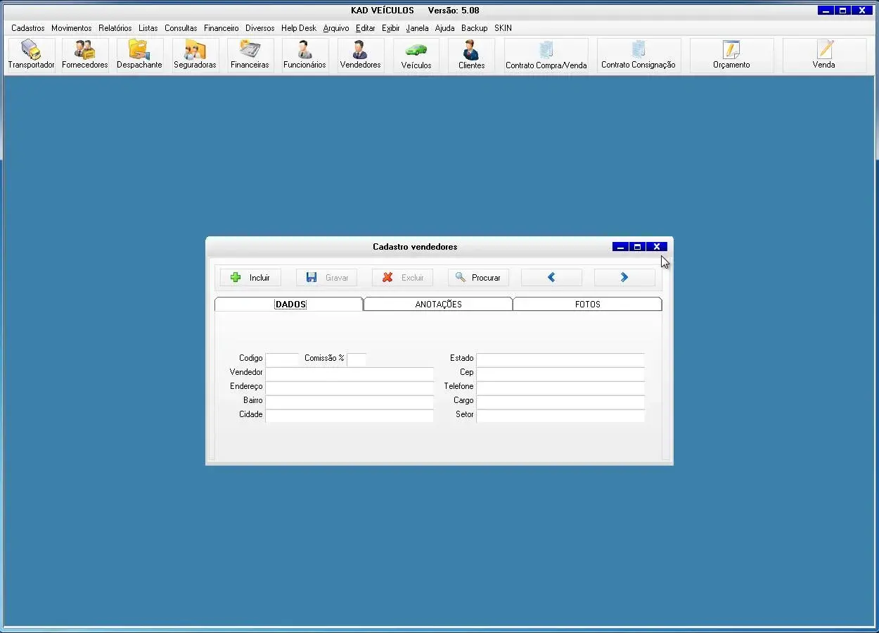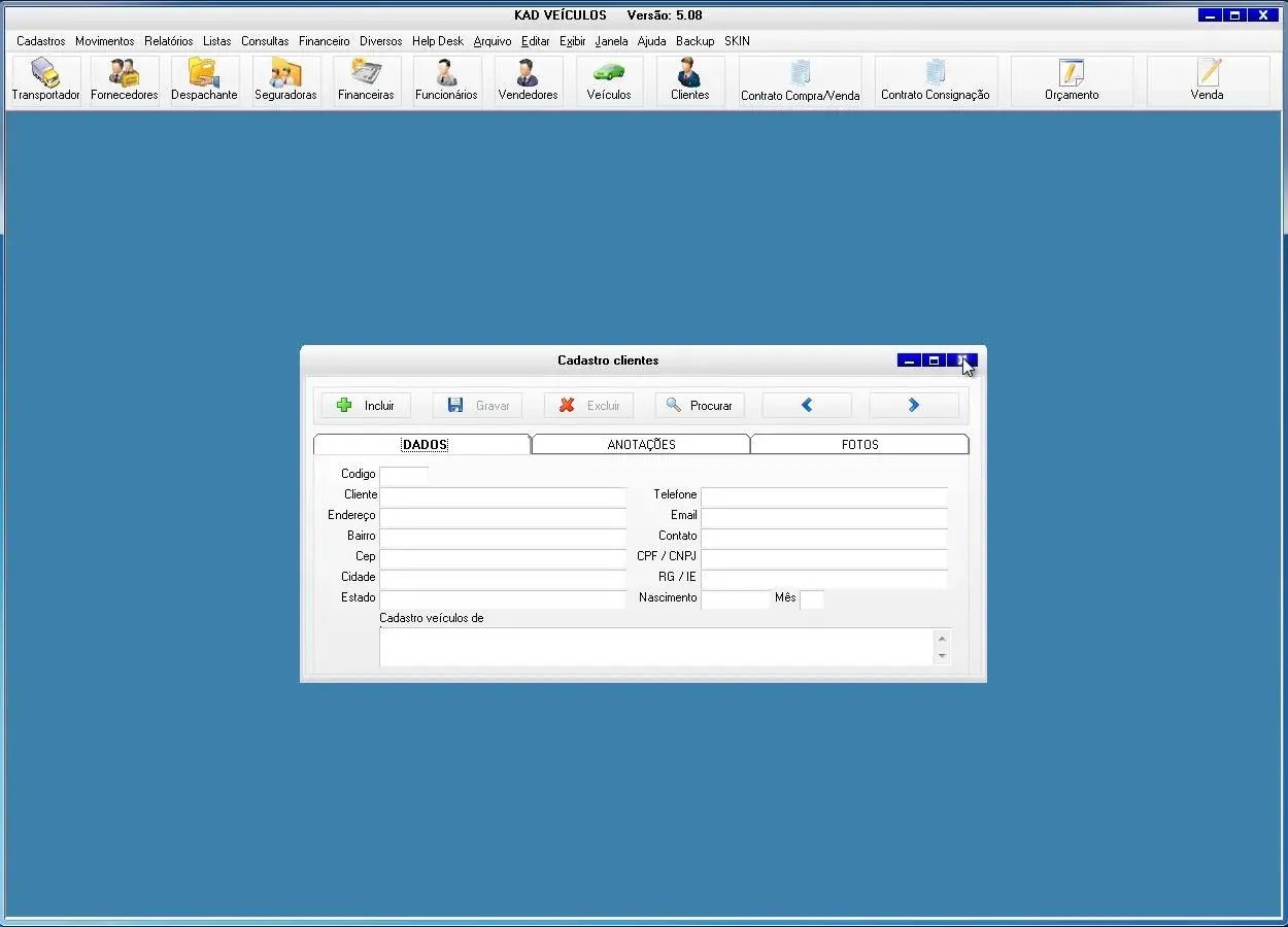 clientes, veículos, transportadoras, fornecedores, despachantes, seguradoras, financeiras, funcionários, vendedores