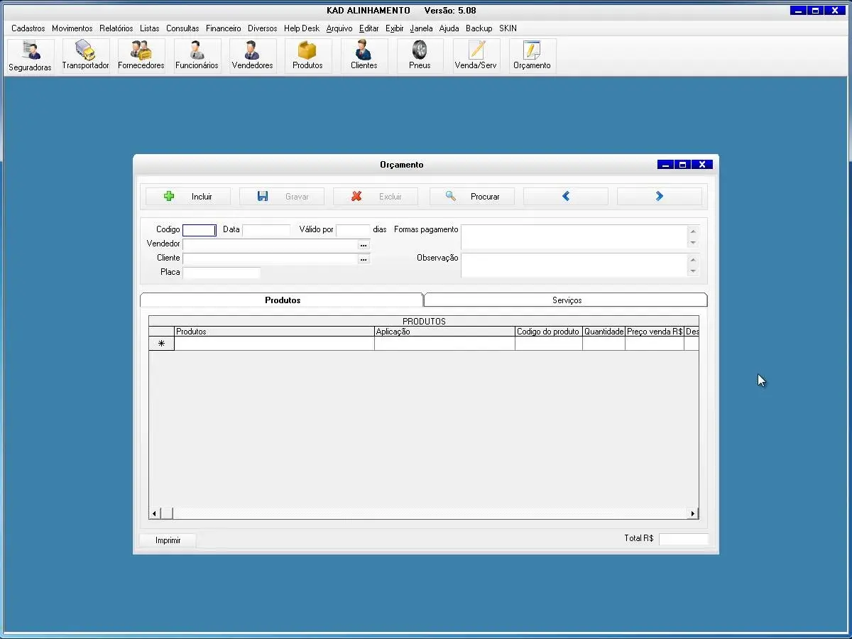O programa para oficina de alinhamento possui cadastro de vendas, serviços, orçamentos