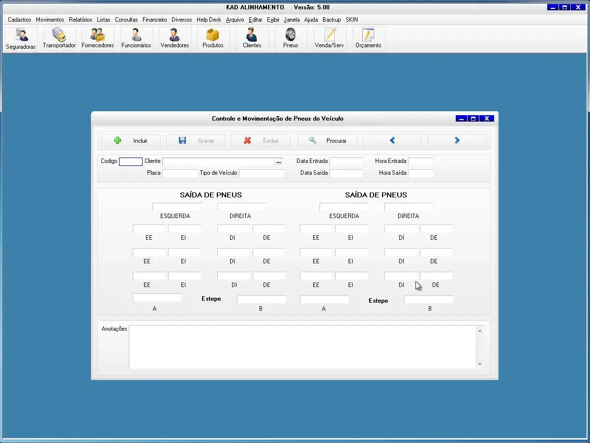 O programa para oficina de alinhamento possui tela para cadastro de movimentação de pneus do veículo